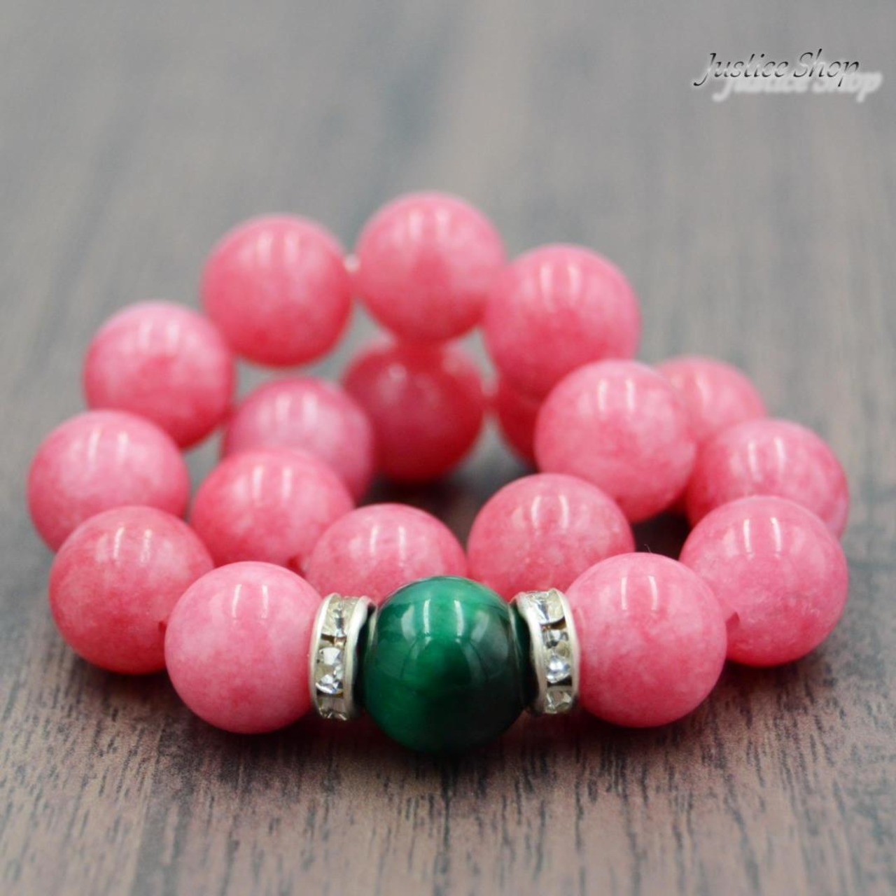 美しいピンク色のインカローズと、パワフルなグリーンタイガーアイが組み合わさった贅沢な一品です。インカローズは愛情を深め、心を開く力を持ち、グリーンタイガーアイはストレスを解消し、自己表現力を高めると言われています。