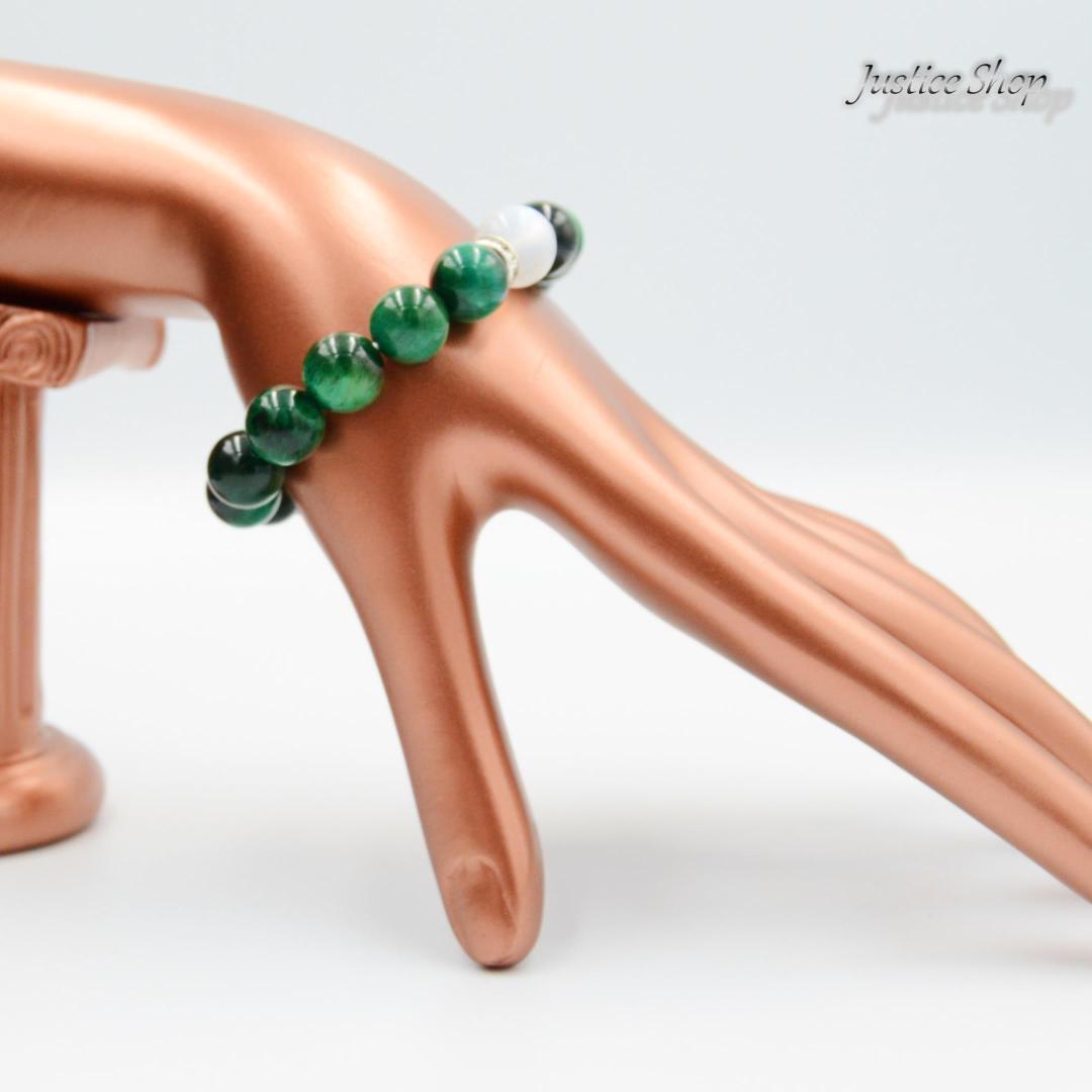 グリーンタイガーアイとブルームーンストーンの組み合わせは、幸運とインスピレーションを呼び込むとされています。グリーンタイガーアイは心の平穏をもたらし、ブルームーンストーンは感情のバランスを整えます。エレガントなデザインでありながら、力強いエネルギーを身に纏うことができる一品です。