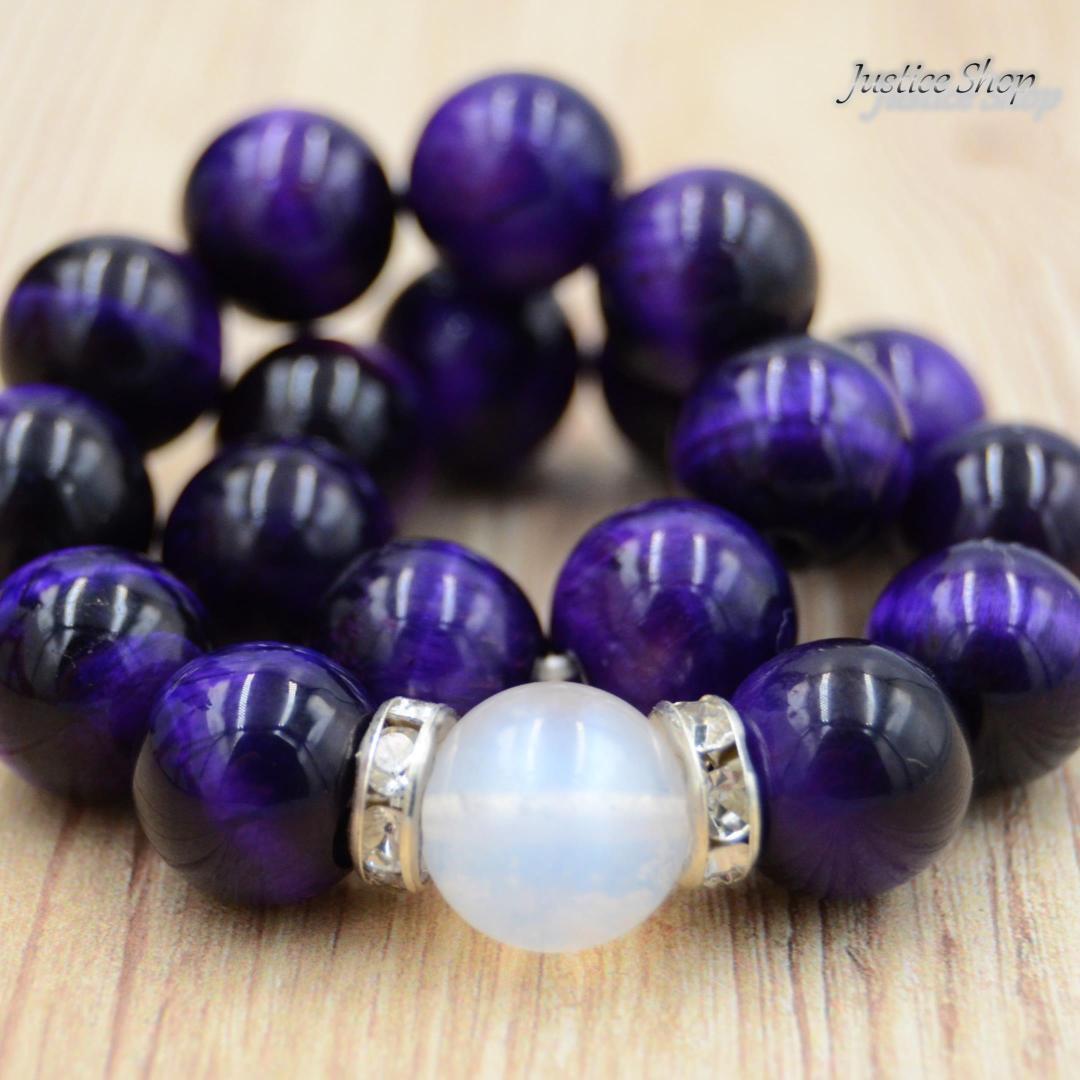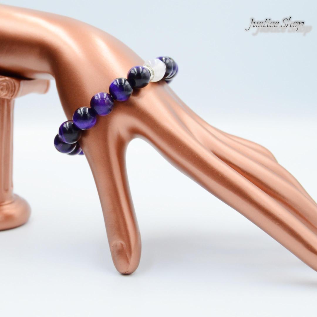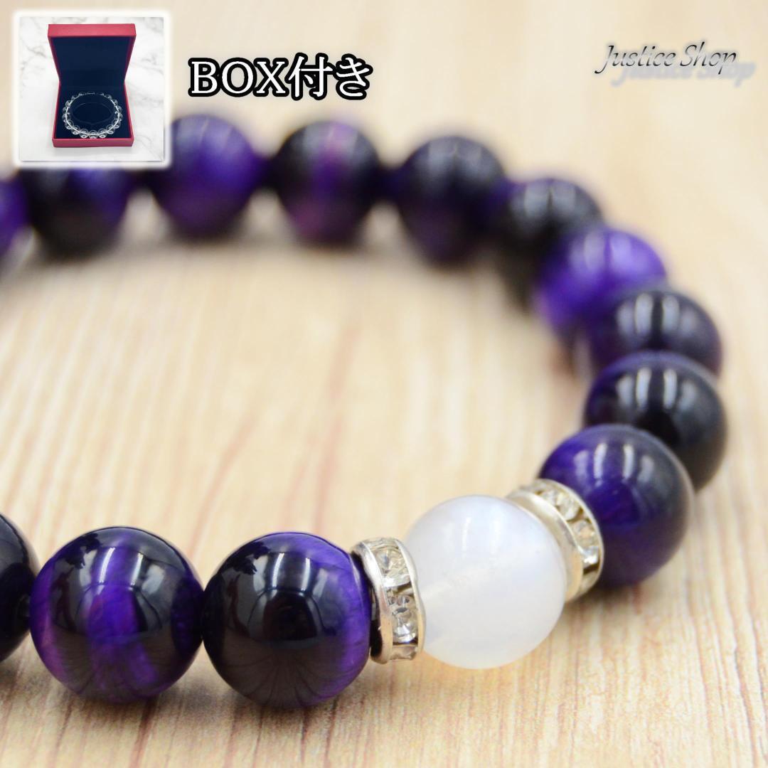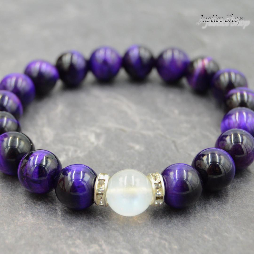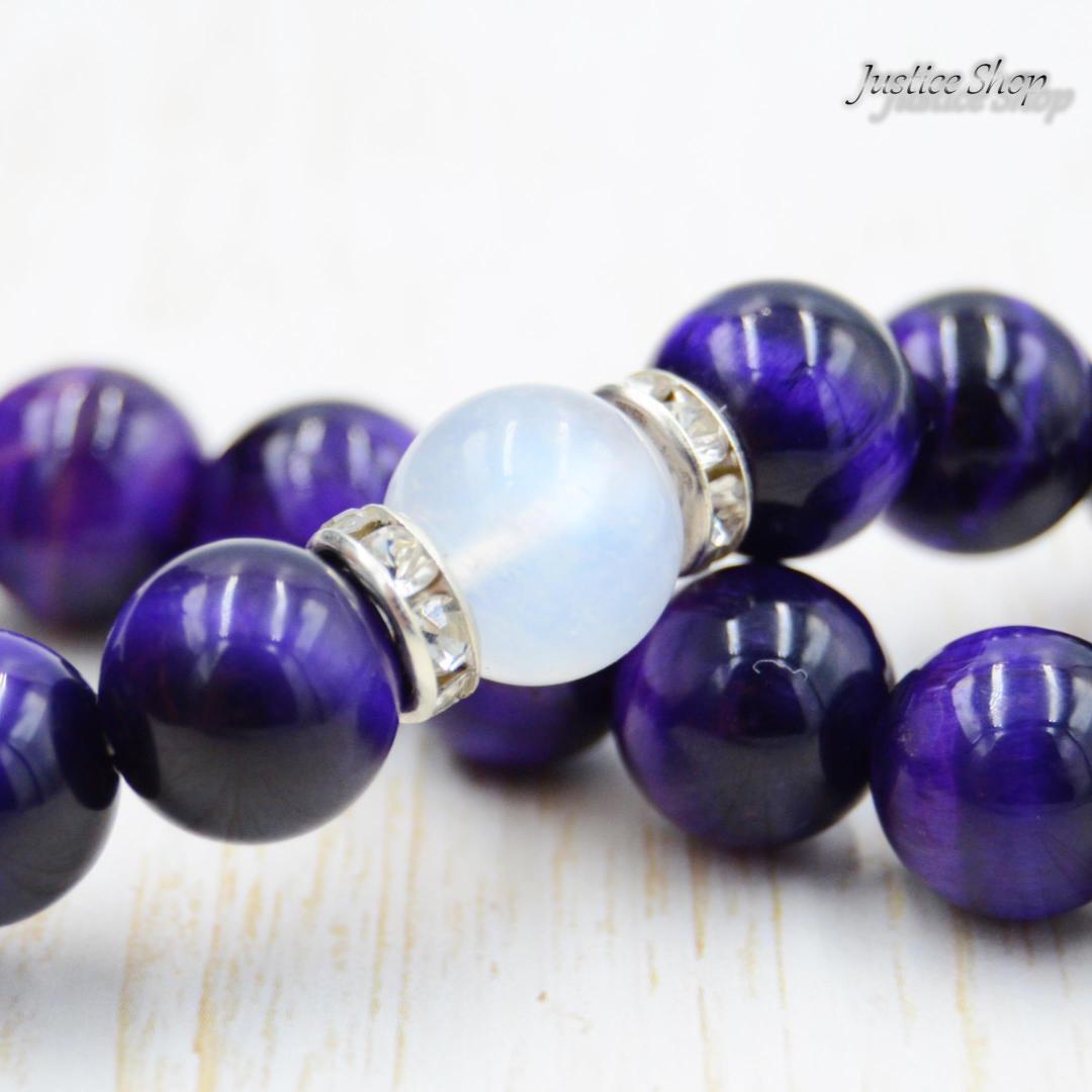パープルタイガーアイとブルームーンストーン7Aが組み合わさったこのブレスレットは、開運と心の安定をもたらしてくれると言われています。パープルタイガーアイは恐怖や不安を払拭し、勇気と自信を高める力を持ち、ブルームーンストーン7Aは女性の強さや愛情を高め、内面の美しさを引き出すとされています。