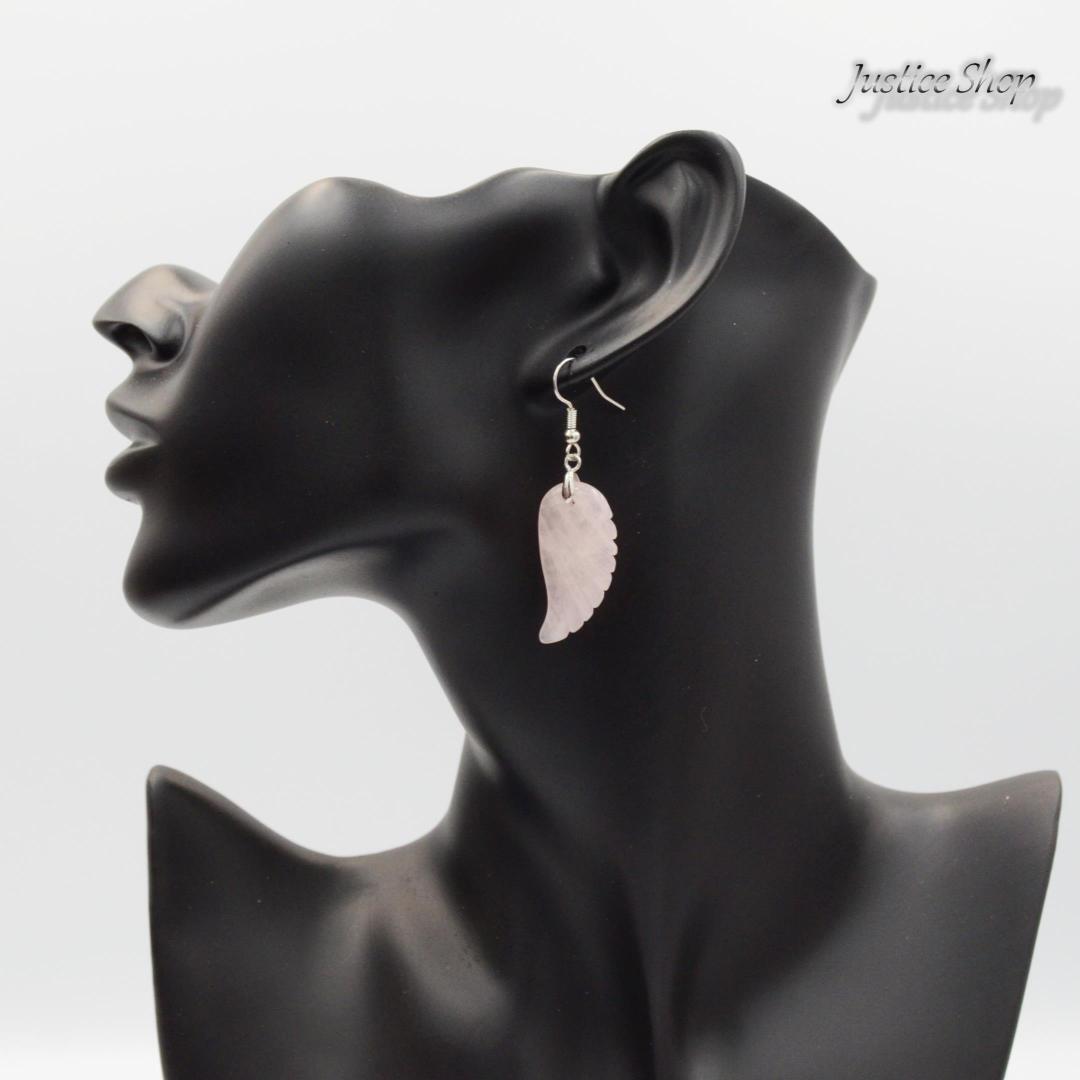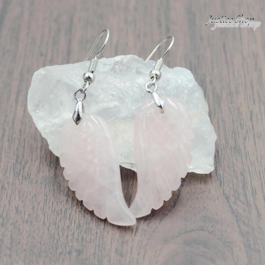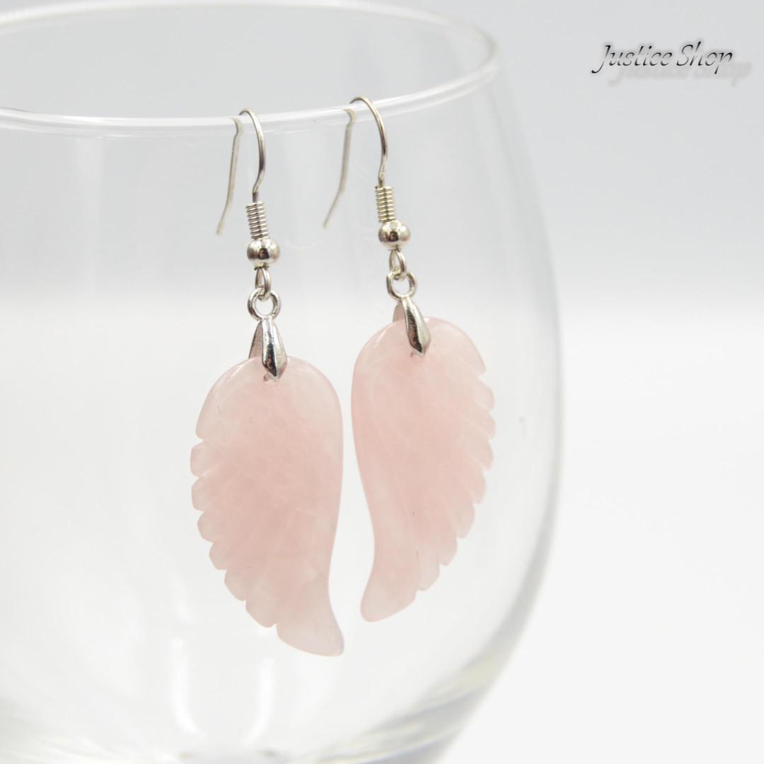 天然のローズクォーツを使用した翼のデザインが特徴的なピアス。パワーストーンとしての効果も期待できます。