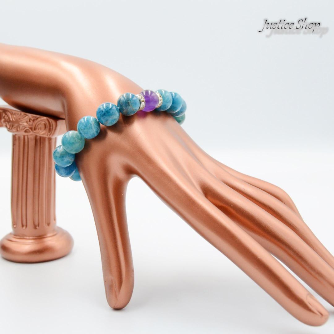アパタイトとアメジストの美しさが融合した、天然石ブレスレット。アパタイトは希望や自己表現をサポートし、アメジストはストレスを和らげると言われています。一つ一つ繊細に編まれたブレスレットは、身につけるだけでパワフルなエネルギーを感じることができます。