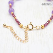 輝くガーネットと深い紫のアメジストが織り成すブレスレット。ティアドロップの形が特徴で、手首に美しく馴染むデザインです。ガーネットは愛と情熱を象徴し、アメジストは心を落ち着かせるパワーがあります。身につけることで、心を落ち着かせ、穏やかな気持ちに導いてくれるでしょう。