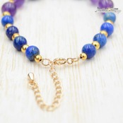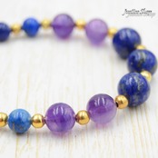 上品なデザインとパワフルなエネルギーが融合したアイテムです。ラピスラズリの深いブルーとアメジストの優しいパープルが、腕元を彩ります。パワーストーンとして知られる天然石ならではの癒しと保護の力を感じてください。