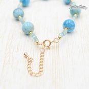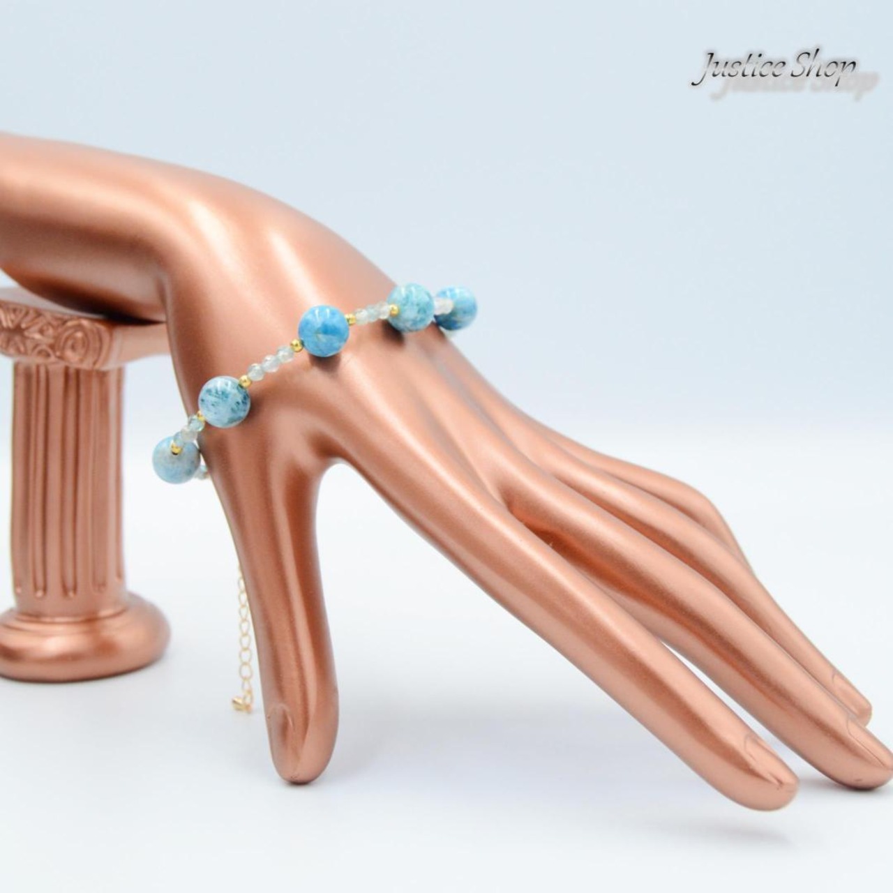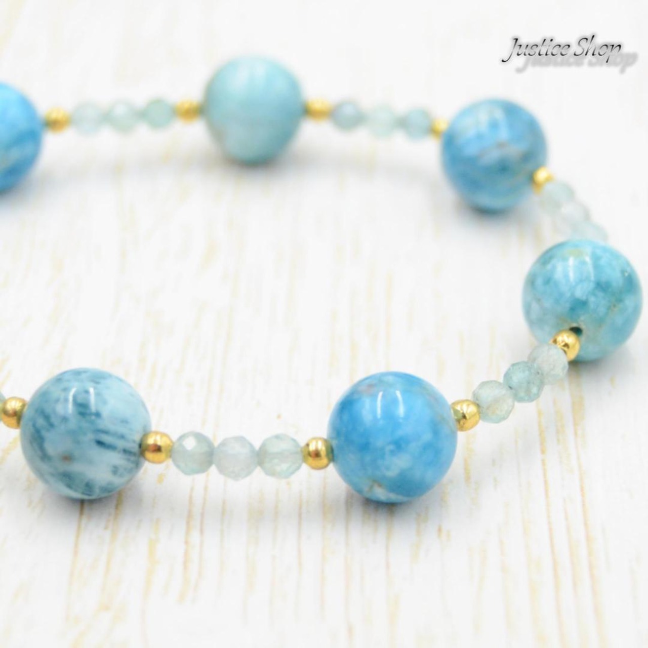 美しいブルーカラーの天然石を使用した高品質のアクセサリーです。ラリマーは海と空を象徴する石と言われ、穏やかな波のような柔らかい色合いが魅力です。一方、アパタイトはコバルトブルーのキラキラとした輝きが特徴で、さまざまな光を反射して輝きます。この二つの石を組み合わせたブレスレットは、自然の美しさとエレガントさを兼ね備えています。
