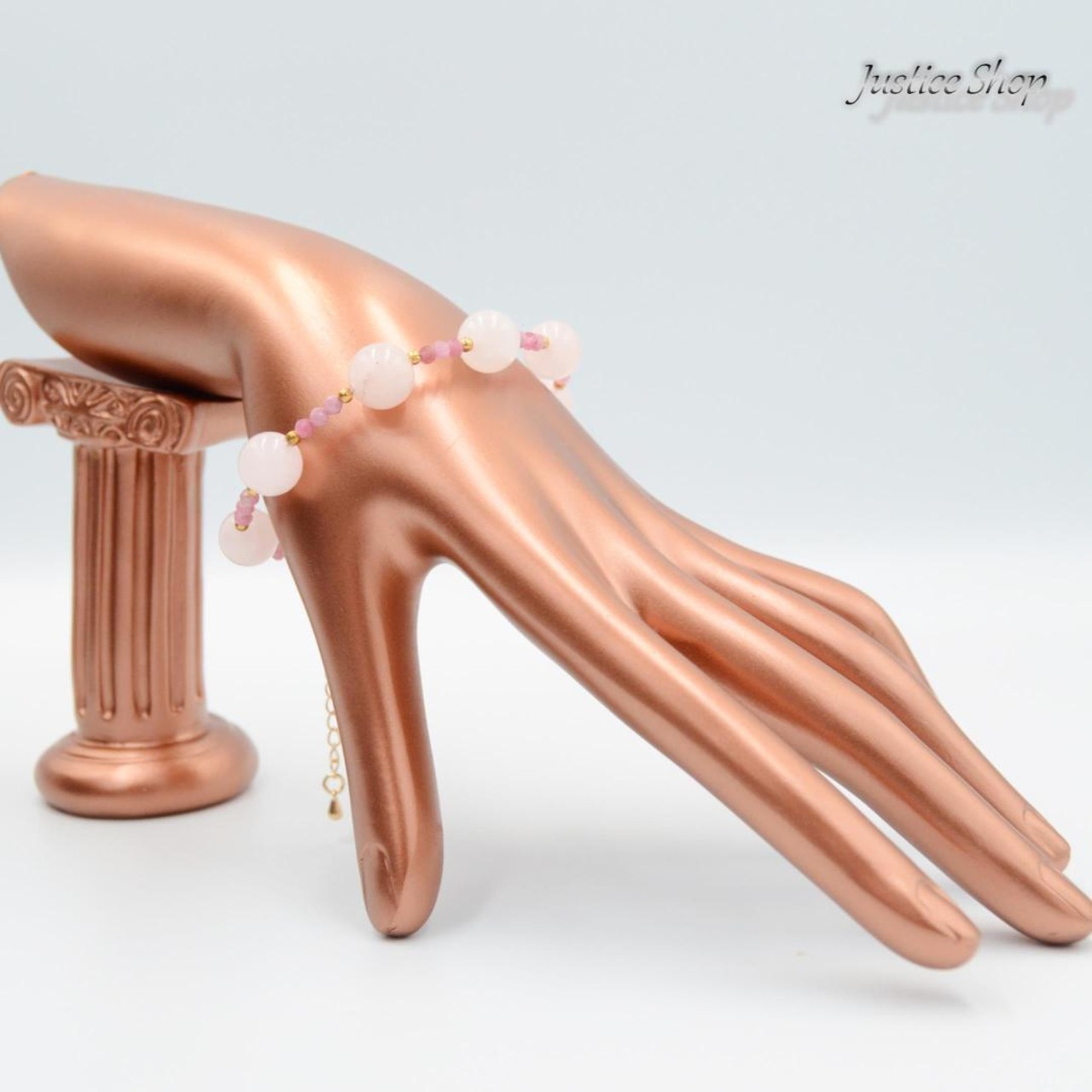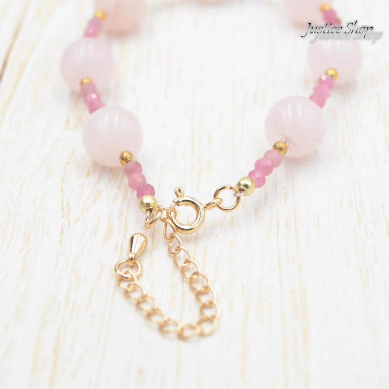 美しいローズクォーツとピンクトルマリンが組み合わさったこのブレスレットは、愛情や癒しを象徴するパワーを持っています。ティアドロップ型の石がアクセントとなり、手元を上品かつ華やかに飾ります。
