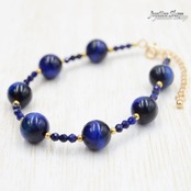 ブルータイガーアイとラピスラズリの組み合わせが美しい一点物のブレスレットです。ブルータイガーアイは自信を持たせ、ラピスラズリは知恵をもたらすと言われ、パワーストーンとしての効果を引き出すアイテムとして最適です。エレガントなデザインはどんなファッションにもマッチし、身につけるだけで幸運を呼び込みます。