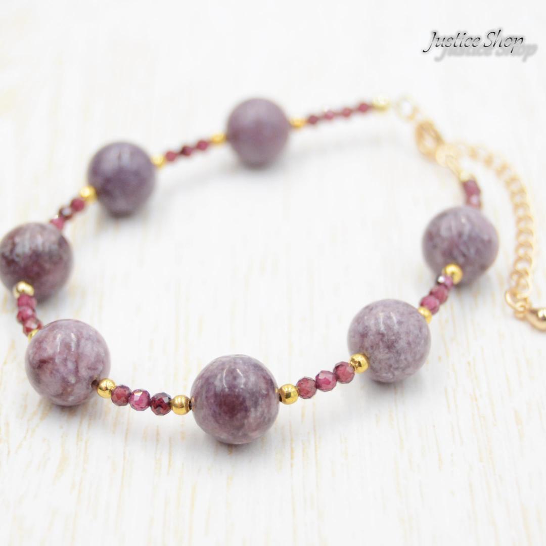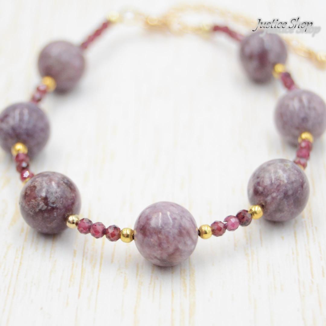 レピドライトとガーネットが組み合わさった、力強さと優雅さを併せ持つブレスレットです。身に着けるだけで、気持ちが落ち着き、ポジティブなエネルギーを感じることができるでしょう。
