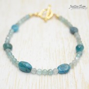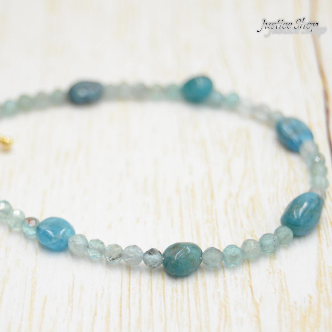 このブレスレットは、美しいアパタイトとアイスタイプアパタイトの組み合わせが特徴です。アパタイトは、持ち主に活力と創造性をもたらすと言われています。また、アイスタイプアパタイトは、心を照らし、持ち主の意志や目的をクリアにさせるとされています。
