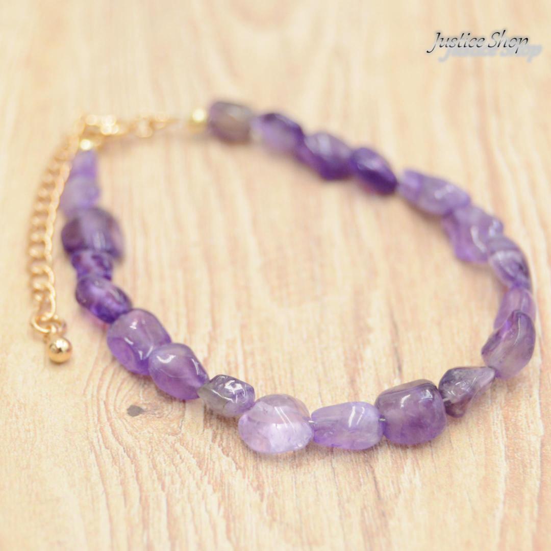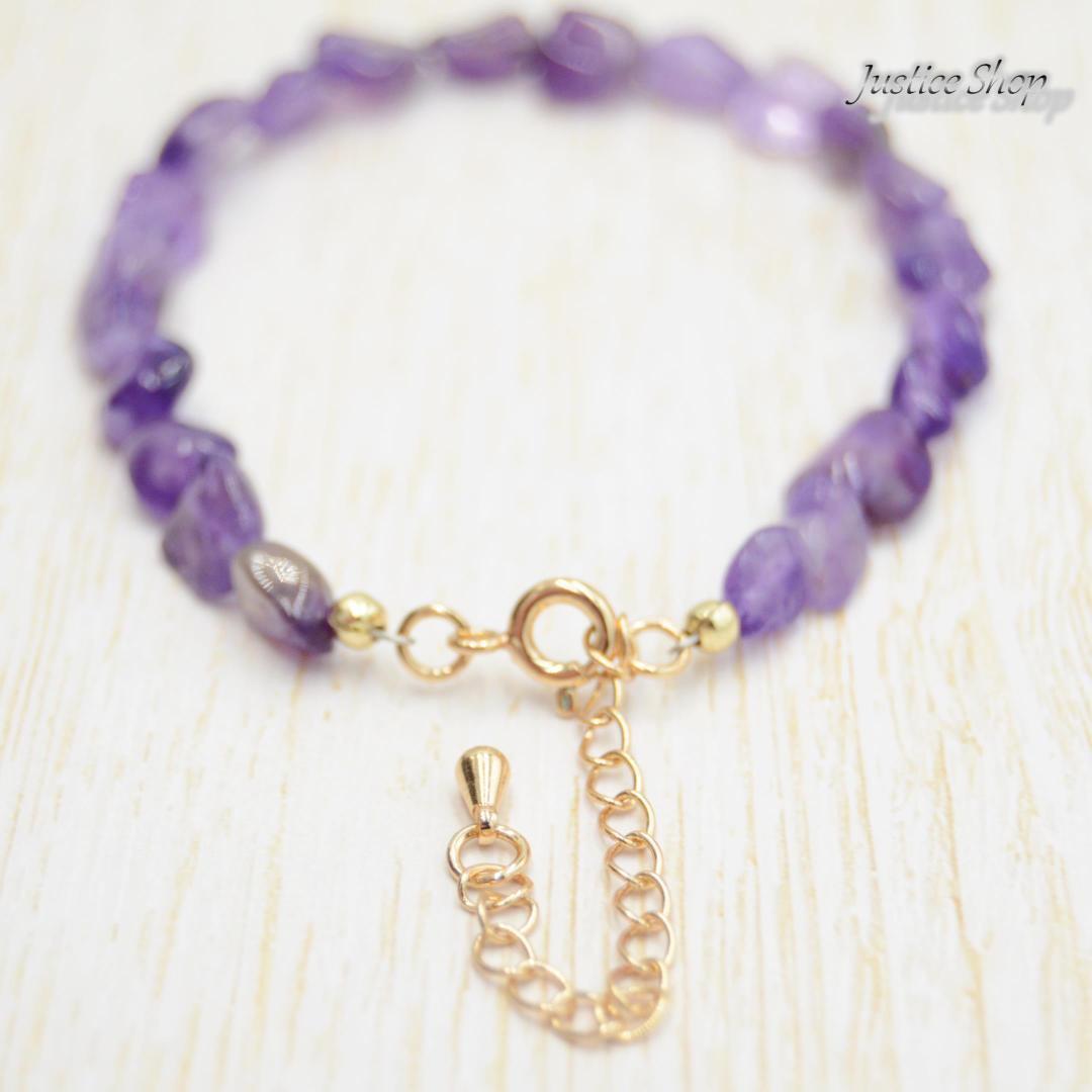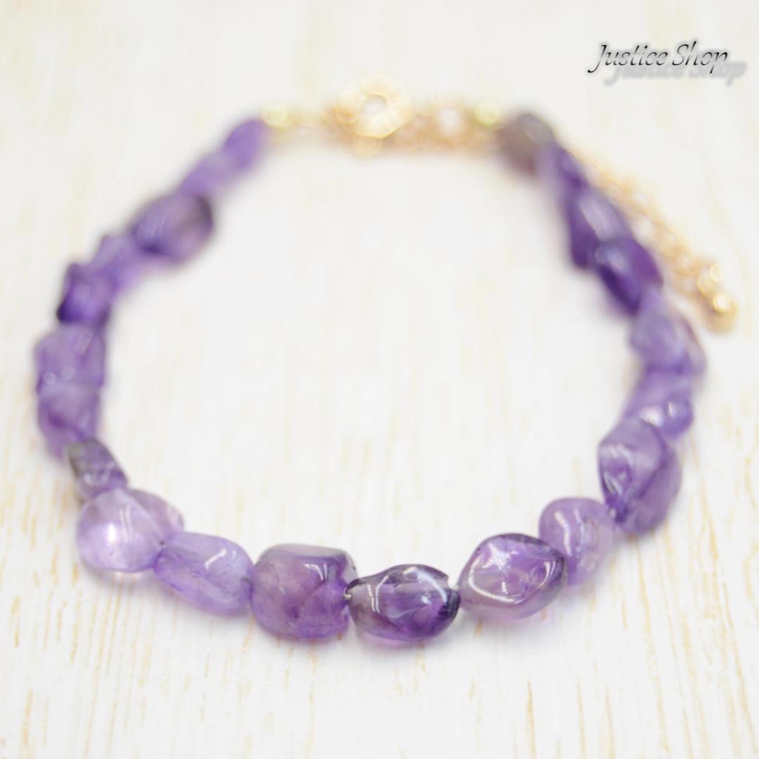アメジストは癒しや安定をもたらすと言われており、パワーストーンとして人気が高い石の1つです。手首を飾るだけでなく、心身を癒すパワーも持っています。ボヘミアンスタイルからモダンな装いまで、幅広いスタイルに合わせやすいデザインです。