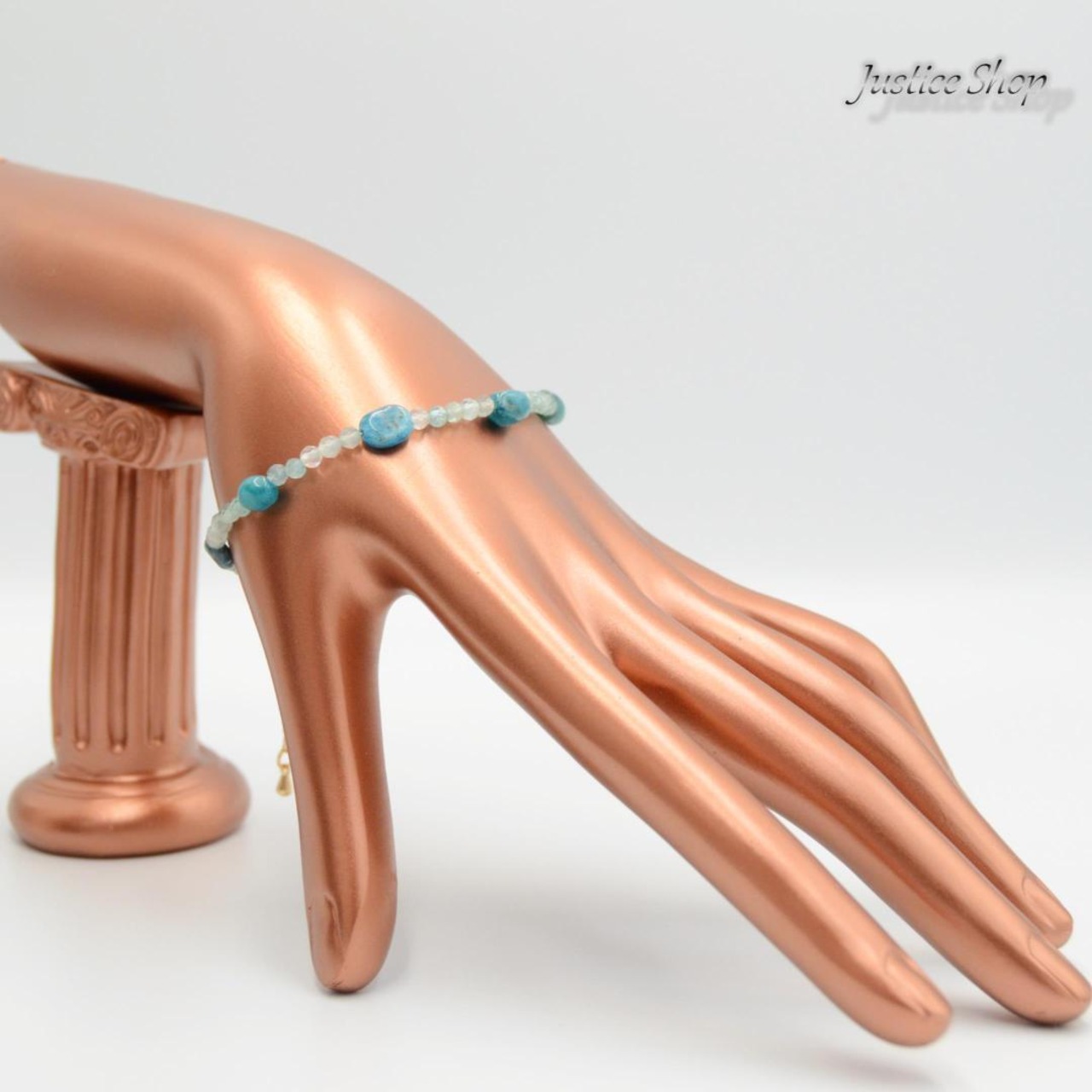 キラキラ輝くアパタイトのティアドロップがアイスタイプアパタイトと組み合わさった、エレガントでユニークなブレスレット。天然石のパワーを身に纏いながら、おしゃれなアクセサリーとしても楽しめる一品です。石のエネルギーを感じながら、日常に彩りを添えてくれることでしょう。