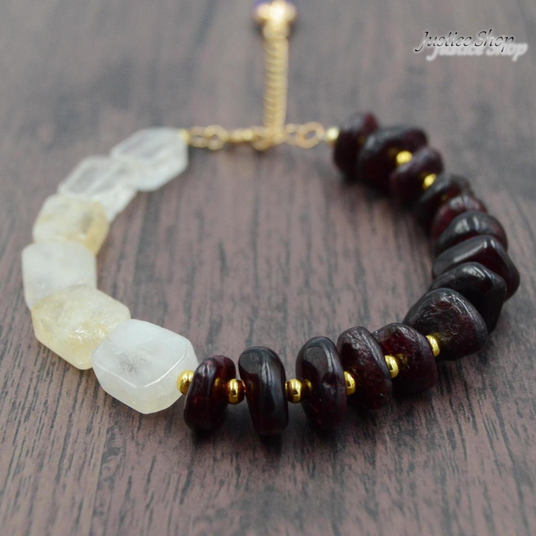 特別なエネルギーを手元にまといませんか?このブレスレットは、宝石チャームに美しいガーネットとシトリンを使用しており、その色合いがあなたの日常に輝きを与えます。天然のガーネットは、持ち主に情熱や勇気をもたらすとされ、一方でシトリンは、希望や繁栄のエネルギーを与えるといわれています。